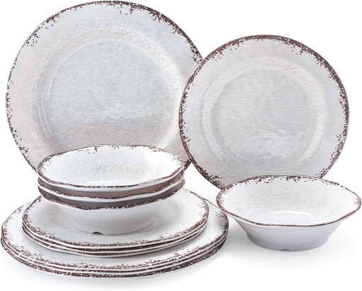 LEHAHA Vintage White Melamine Dinnerware set-12 Piece Lightweight Unbreakable Outdoor Camper Plates/Dishes and Bowls Set, Service for 4, Dishwasher Safe…
