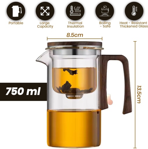 BLUENIYA 750ml Glass Teapot with Magnetic Infuser - Borosilicate Heat-Resistant Tea Pot with Wooden Handle & Lid for Loose Leaf Tea, Hot & Cold Drinks, Home & Office