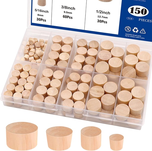 Tnisesm 150 Pieces 4 Sizes Wood Plugs 3/16 Inch, 5/16 Inch, 3/8 Inch, 1/2 Inch Wooden Hole Plugs Button Plugs Hardwood Hole Plugs for Holes in Locking Hole Tube Furniture