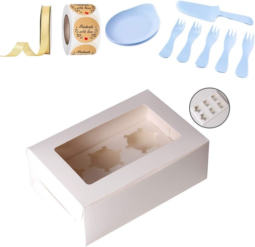 Mayata 10pcs White Bakery Boxes with Window Cake Box for Pastries, Cookies, Pie, Cupcakes, comes with cake cutlery cake stickers and cake ribbons (6 Holders Cake Carrier(24x16x7.5cm))