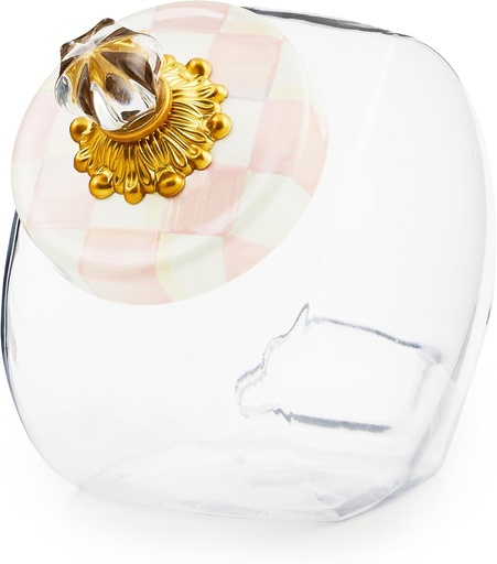MACKENZIE-CHILDS Sweets Jar with Enamel Lid, Small Glass Cookie Jar or Kitchen Jar, 0.5-Gallon Capacity, Pink-and-White Rosy Check