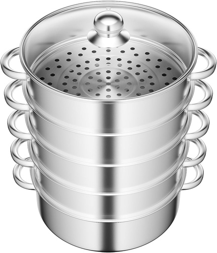 Multifunctional 5-Tier Stainless Steel Steamer with Glass Lid, 28cm Steamer Pot Steaming Cookware with Dishwasher Safe, for Vegetables, Seafood, Dim Sum