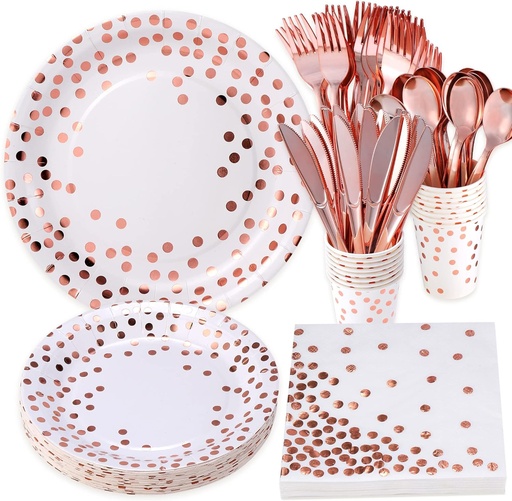 175PCS Rose Gold Party Supplies,Rose Gold Dot on White Paper Plates Napkins and Cups,Disposable Dinnerware Sets, Plastic Forks Spoons and Knives Set Serve 25 for Wedding Birthday Party Decorations