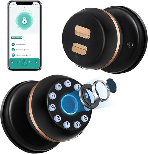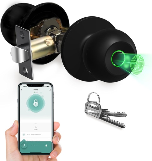Smart Fingerprint Door Knob - Biometric Lock with App Bluetooth Control, Keyless Thumbprint Entry Door Lock for Home, Cloakroom, Hotels, Apartments, Offices, Perfect for Bedroom Security (Black)