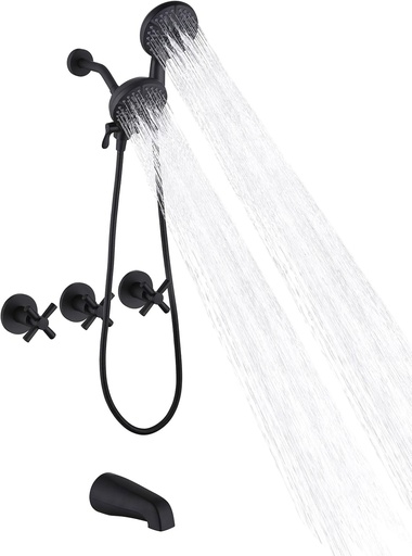 3 Handle Tub Shower Faucet Set Wall Mount Bathtub Shower Faucet with Tub Spout Double Shower Head Combo Set with Tup Spout, Matte Black