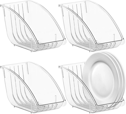 4 Pcs Paper Plate Holders, 9.8" Transparent Dish Racks, Vertical Plate Dispensers with 5 Slots, Compact Clear Bowl Organizers, Kitchen Cabinet Countertop Storage Shelves